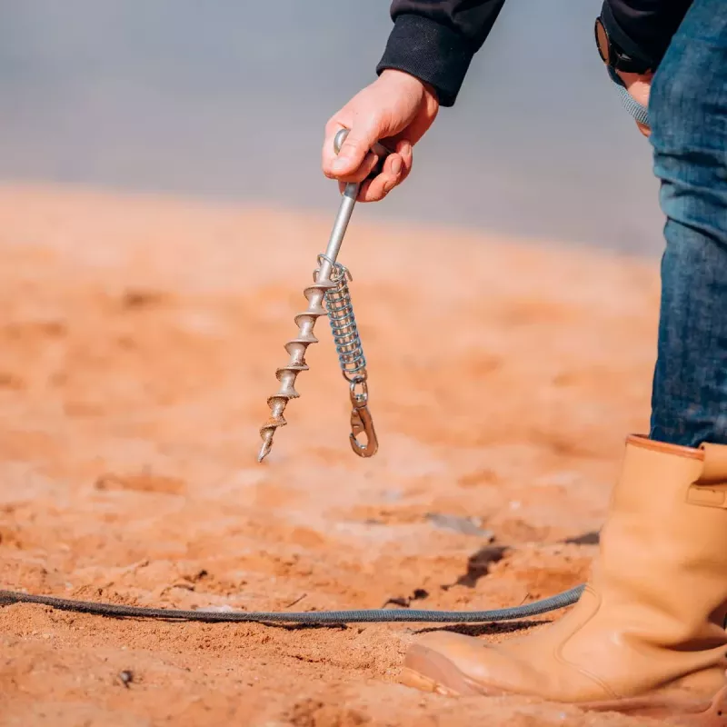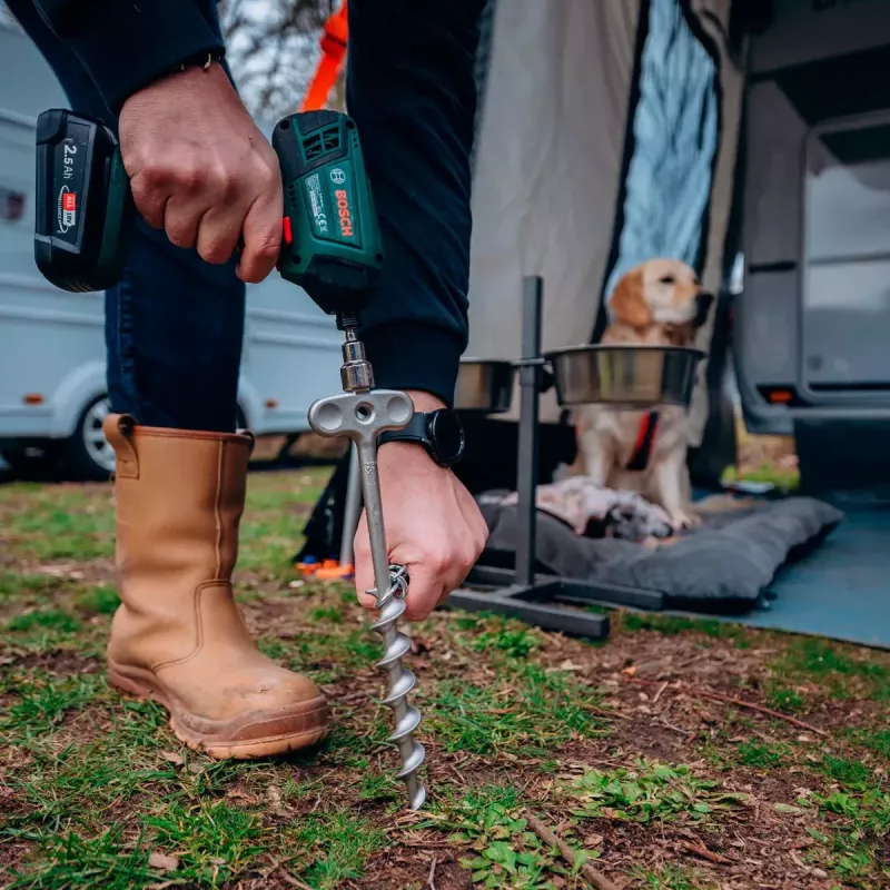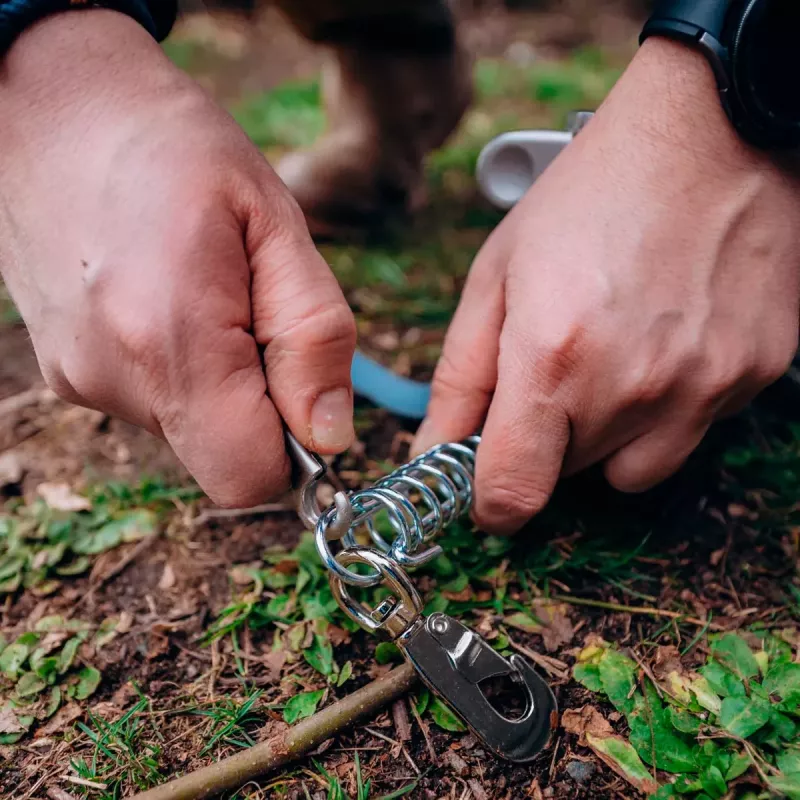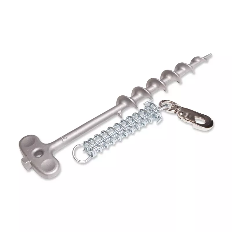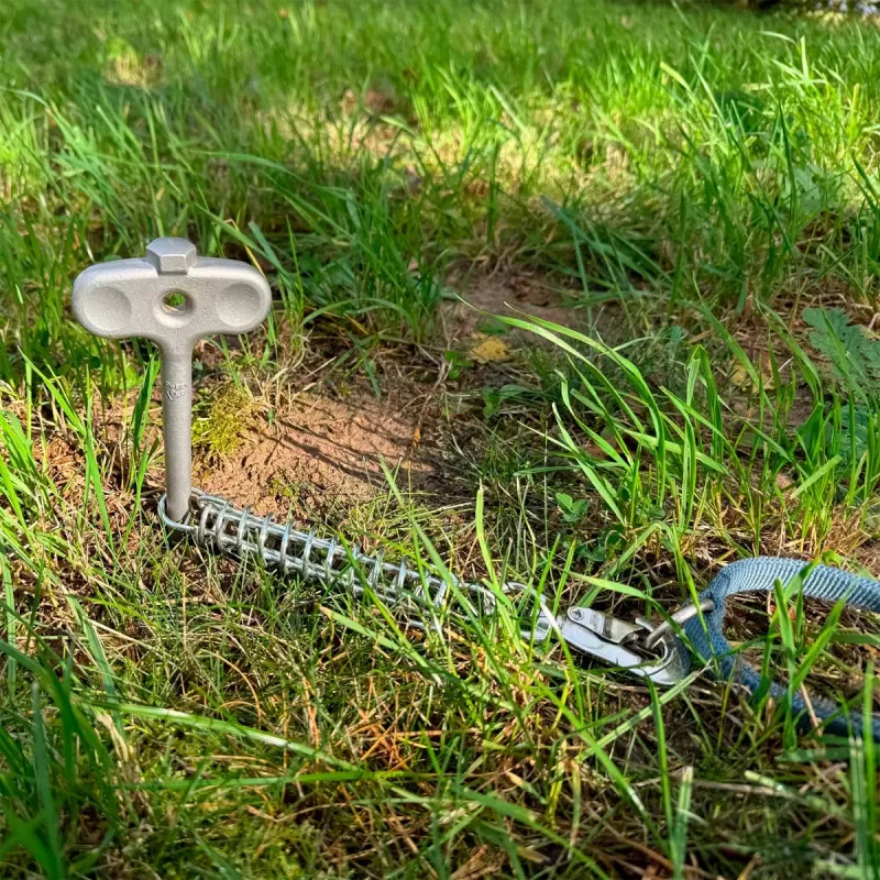 L'altezza regolabile mantiene la forza di trazione vicina al terreno, garantendo un ancoraggio sicuro del PetPeg 2.0. Basta posizionare la molla a terra, inserire la vite attraverso l'anello aperto e avvitarla manualmente o con un trapano il più in profondità possibile. Quindi verificare che sia saldamente in posizione.