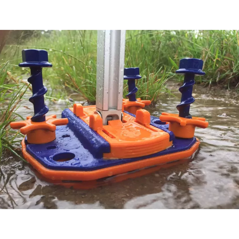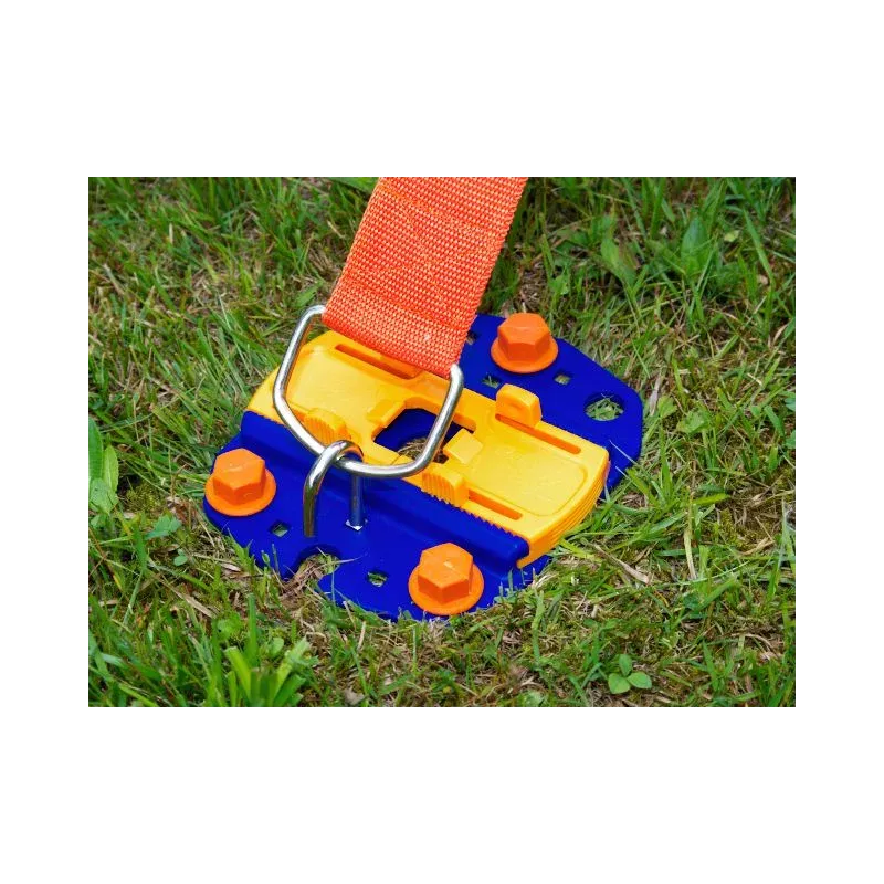 Possono essere usate anche per fissare al suolo le cinghie antitormenta utilizzando gli appositi ganci. Grazie al design brevettato, tutte le comuni gambe della tenda da sole rimangono saldamente a terra. Le due parti arancioni scorrono semplicemente sulla base della tenda da sole o della gamba della tenda.