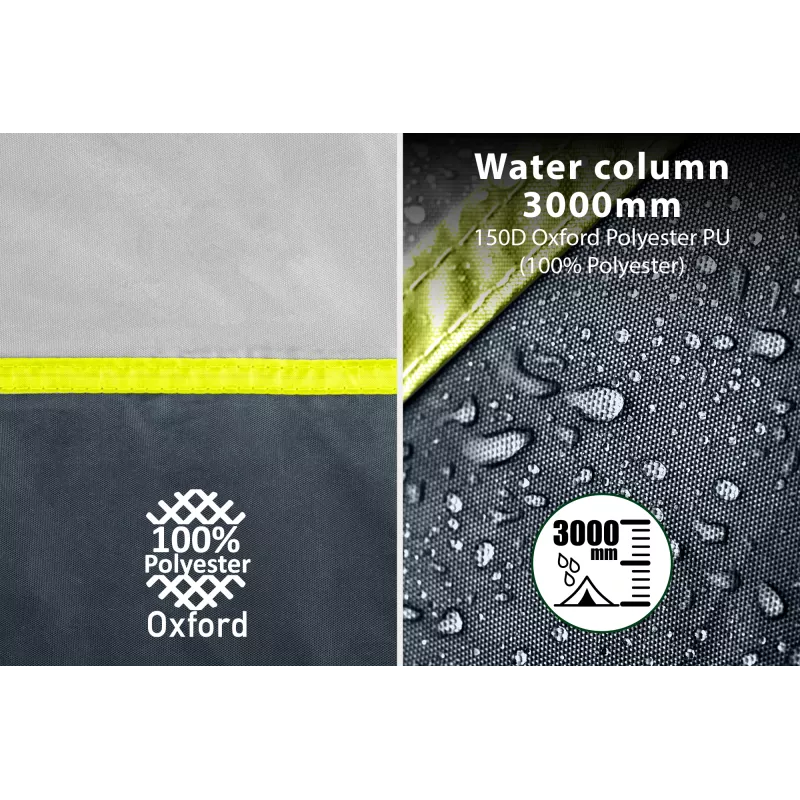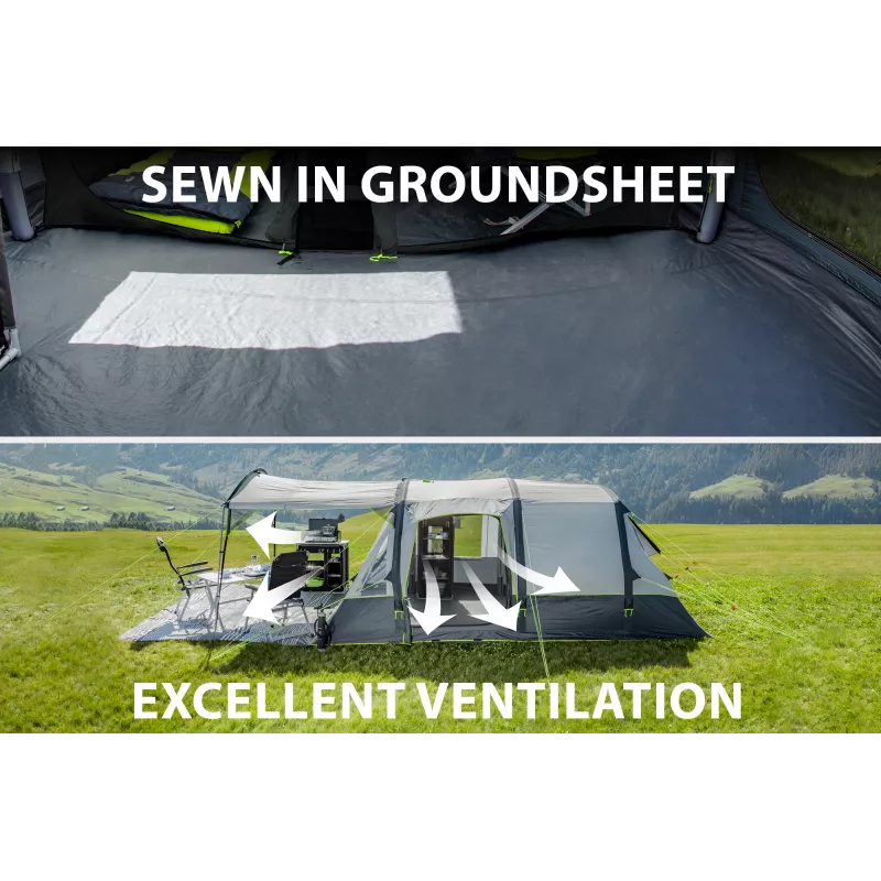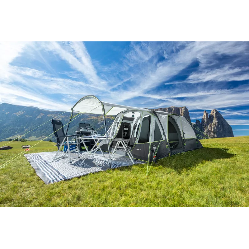 Il catino integrato in resistente tessuto PE protegge efficacemente dall’umidità e dallo sporco, migliorando l’isolamento dal terreno e il comfort abitativo. La tenda è dotata di un’entrata anteriore e di un’entrata laterale con tettuccio di protezione, che facilitano l’accesso e la gestione degli spazi interni, offrendo maggiore flessibilità durante la permanenza in campeggio.