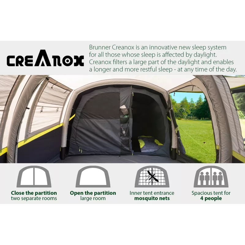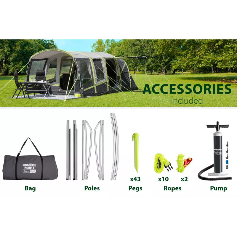 La Brunner Pure 4 AIRtech Authentic è una tenda family di alto livello, progettata per offrire ampio spazio abitativo e massimo comfort alle famiglie che amano il campeggio, anche in climi caldi. Grazie alla struttura pneumatica A.I.R. Tech, il montaggio risulta rapido e intuitivo, garantendo al tempo stesso stabilità e affidabilità.