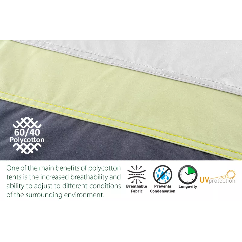 Un elemento distintivo della Pure 4 è il tessuto traspirante in policotone, che contribuisce a mantenere l’ambiente interno notevolmente più fresco durante le giornate estive. Questa caratteristica rende la tenda particolarmente adatta a soggiorni prolungati e a vacanze in zone con temperature elevate, assicurando un microclima interno confortevole e ben ventilato.