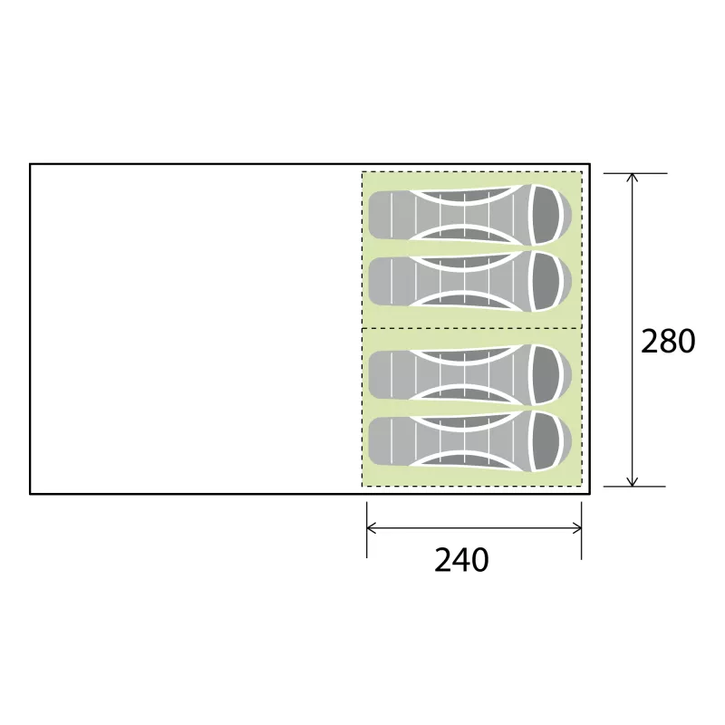 Gli interni spaziosi offrono un comfort ideale per almeno 4 persone e possono essere ulteriormente ampliati rimuovendo la parete anteriore completamente rimovibile, trasformabile anche in veranda. L’ampia zona giorno è pensata per la vita quotidiana in campeggio, con numerosi dettagli funzionali come tasche portaoggetti, sospensione per lampada, accessi cavi e punti di fissaggio per l’illuminazione interna.
