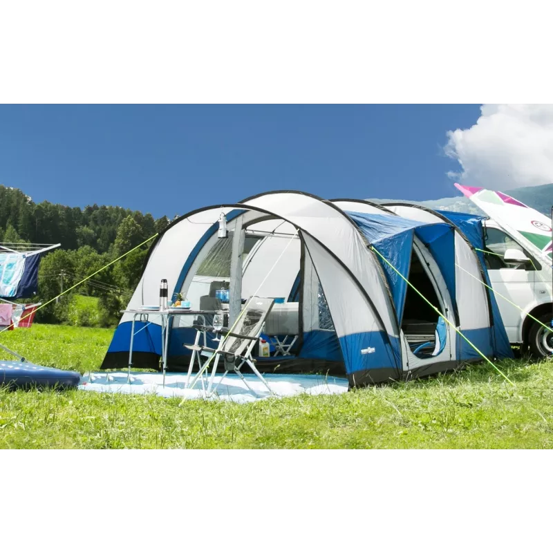 La Brunner Albatros è una veranda moderna e indipendente per minibus, progettata per offrire spazio abitativo aggiuntivo, comfort e grande versatilità durante il campeggio. La struttura autoportante consente un utilizzo pratico e flessibile, adattandosi perfettamente alle esigenze dei viaggiatori itineranti.