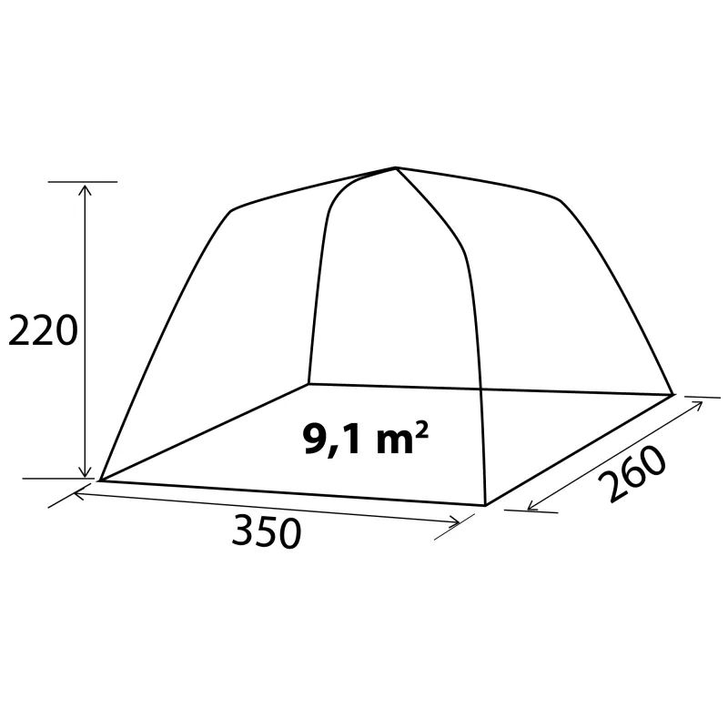 - Accessori di serie inclusi: camera interna, telo con catino, paleria, pali verticali, palo di collegamento, corde, picchetti, sacca custodia