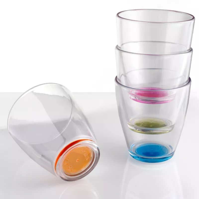 Realizzati in policarbonato di alta qualità (SAN), offrono la brillantezza del vetro ma senza rischio di rottura, rendendoli perfetti per campeggio, camper, barca, giardino e uso quotidiano. Con fondo colorato e pratico anello antislip. Impilabile.