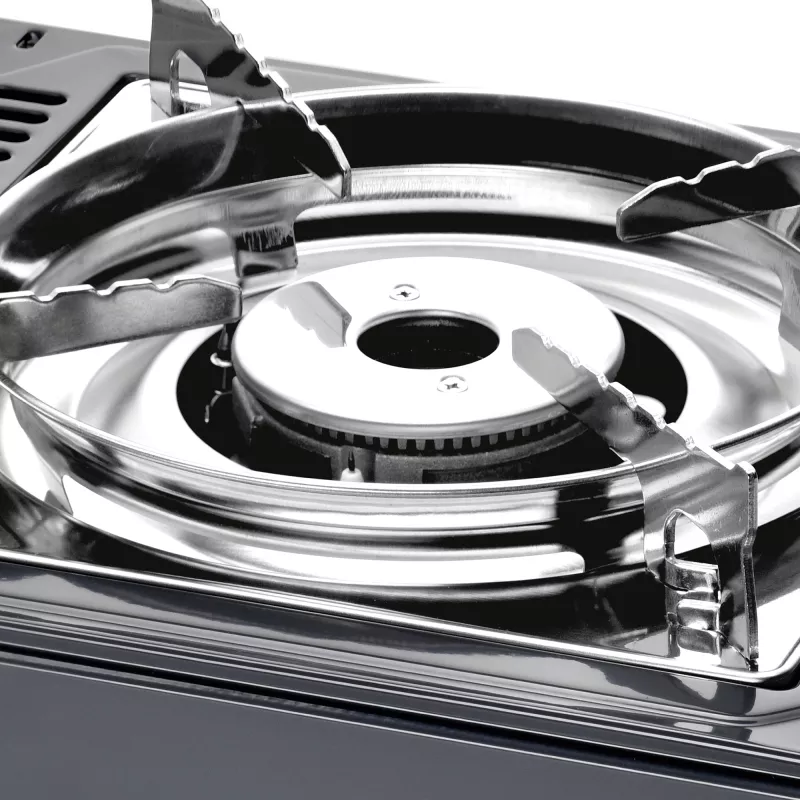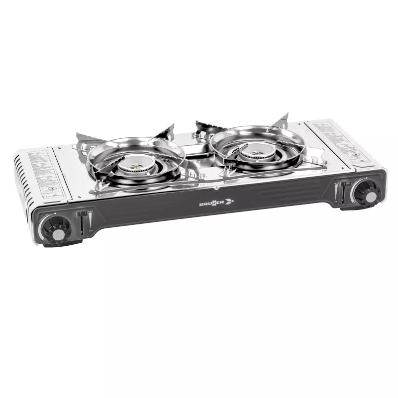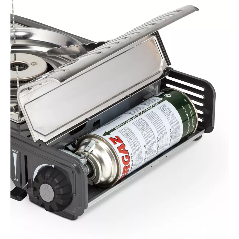 La struttura robusta ma leggera assicura stabilità durante l’uso, mentre il design compatto consente un facile trasporto e una sistemazione rapida nei vani cucina del camper o nelle borse da campeggio. supporti per pentole in acciaio inox con deflettore per il vento garantiscono prestazioni costanti anche in condizioni difficili. Dettagli importanti come i coperchi del vano cartuccia in acciaio inox e le due manopole di controllo garantiscono un funzionamento senza sforzo.