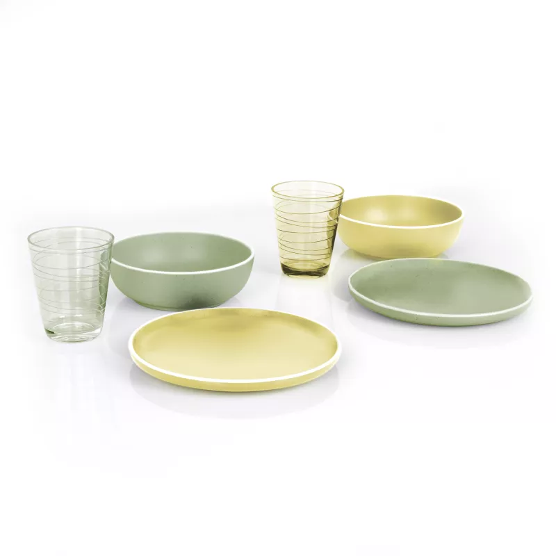 - Materiale: Melamina/minerale della serie “Stone Touch”, con superficie dura e stabile che richiama la porcellana ma mantiene leggerezza, resistenza agli urti e durata nel tempo.