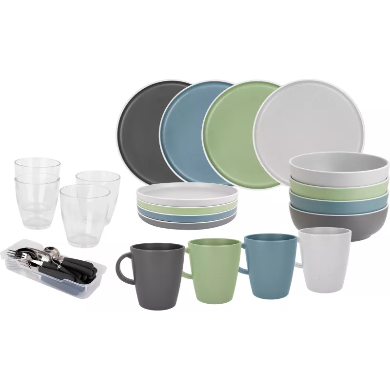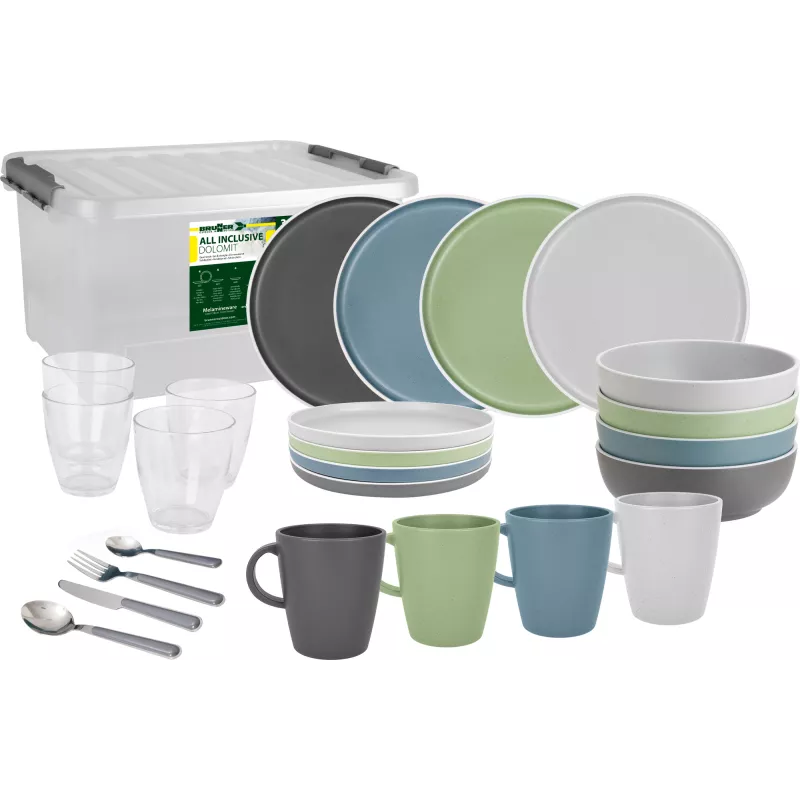 Il set Brunner All Inclusive Dolomit è la soluzione completa per chi desidera unire eleganza e funzionalità durante le proprie avventure all'aperto. Realizzato in melamina di alta qualità con finitura "Stone Touch", questo set da 36 pezzi offre un design raffinato e una resistenza superiore, perfetto per campeggi, picnic e viaggi in camper.