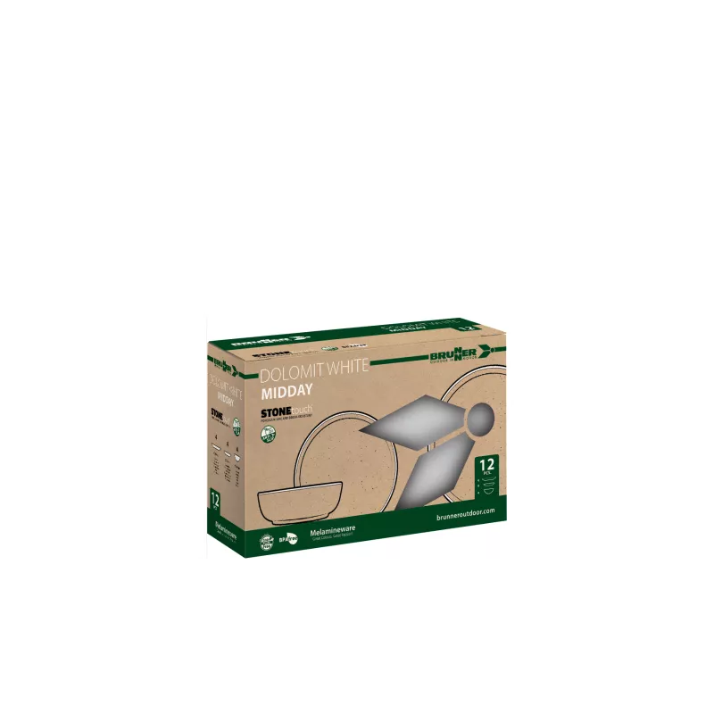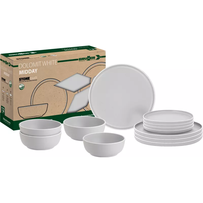 Il set Brunner Midday Dolomit White è la soluzione ideale per chi desidera unire eleganza e funzionalità durante le proprie avventure all'aperto. Realizzato in melamina di alta qualità con finitura "Stone Touch", questo set da 12 pezzi offre un design raffinato e una resistenza superiore, perfetto per campeggi, picnic e viaggi in camper.