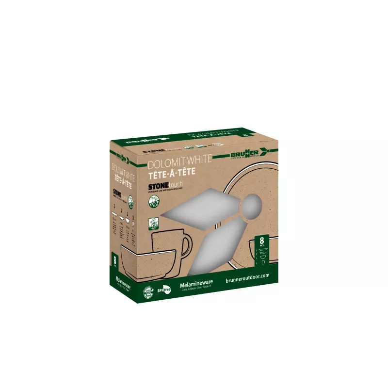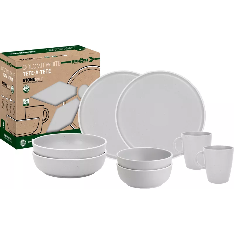 Il set Brunner Tête-à-Tête Dolomit White è la soluzione ideale per chi desidera unire eleganza e funzionalità durante le proprie avventure all'aperto. Realizzato in melamina di alta qualità con finitura "Stone Touch", questo set da 8 pezzi offre un design raffinato e una resistenza superiore, perfetto per campeggi, picnic e viaggi in camper.