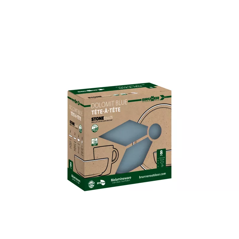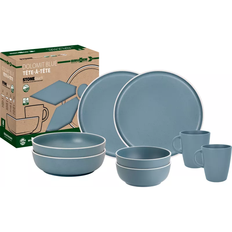 Il set Brunner Tête-à-Tête Dolomit Blue è la soluzione ideale per chi desidera unire eleganza e funzionalità durante le proprie avventure all'aperto. Realizzato in melamina di alta qualità con finitura "Stone Touch", questo set da 8 pezzi offre un design raffinato e una resistenza superiore, perfetto per campeggi, picnic e viaggi in camper.