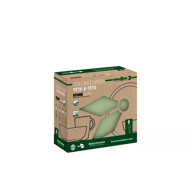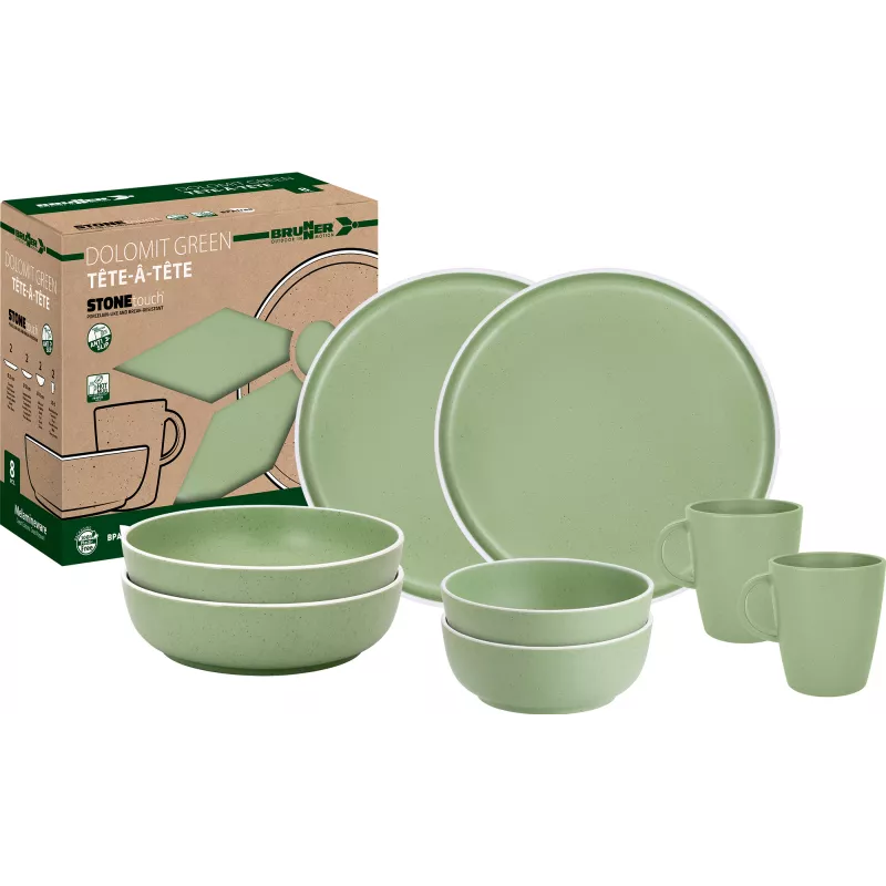 Il set Brunner Tête-à-Tête Dolomit Green è la soluzione ideale per chi desidera unire eleganza e funzionalità durante le proprie avventure all'aperto. Realizzato in melamina di alta qualità con finitura "Stone Touch", questo set da 8 pezzi offre un design raffinato e una resistenza superiore, perfetto per campeggi, picnic e viaggi in camper.