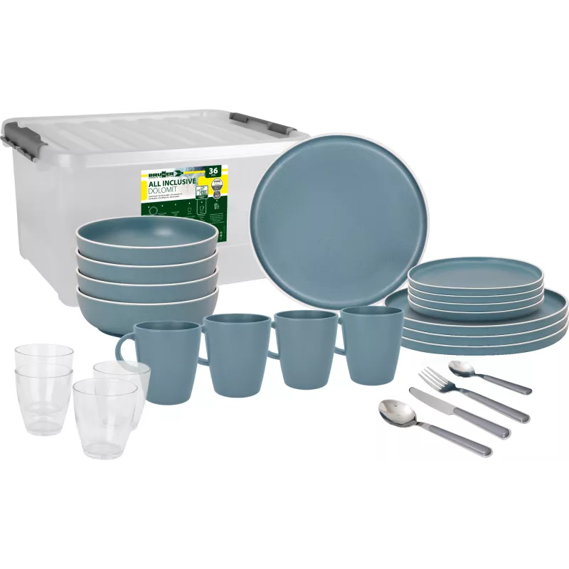 Il set Brunner All Inclusive Dolomit Blue è la soluzione completa per chi desidera unire eleganza e funzionalità durante le proprie avventure all'aperto. Realizzato in melamina di alta qualità con finitura "Stone Touch", questo set da 36 pezzi offre un design raffinato e una resistenza superiore, perfetto per campeggi, picnic e viaggi in camper.