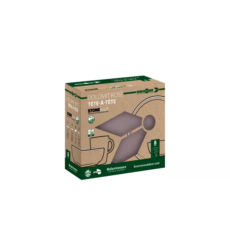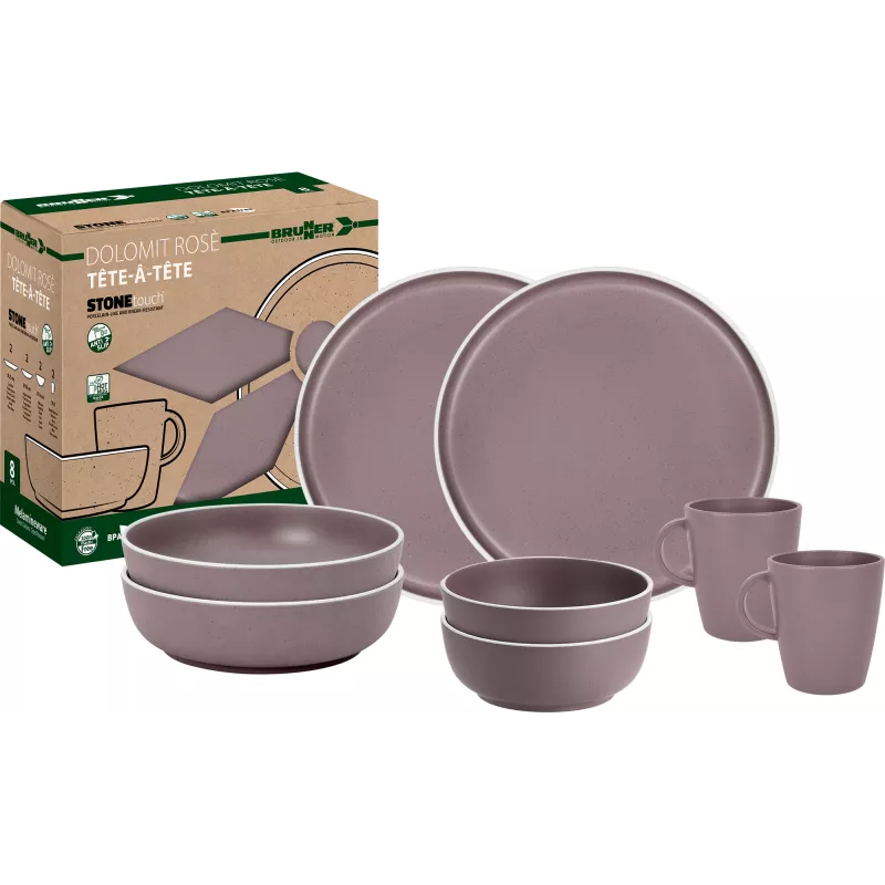 Il set Brunner Tête-à-Tête Dolomit Rosè è la soluzione ideale per chi desidera unire eleganza e funzionalità durante le proprie avventure all'aperto. Realizzato in melamina di alta qualità con finitura "Stone Touch", questo set da 8 pezzi offre un design raffinato e una resistenza superiore, perfetto per campeggi, picnic e viaggi in camper.