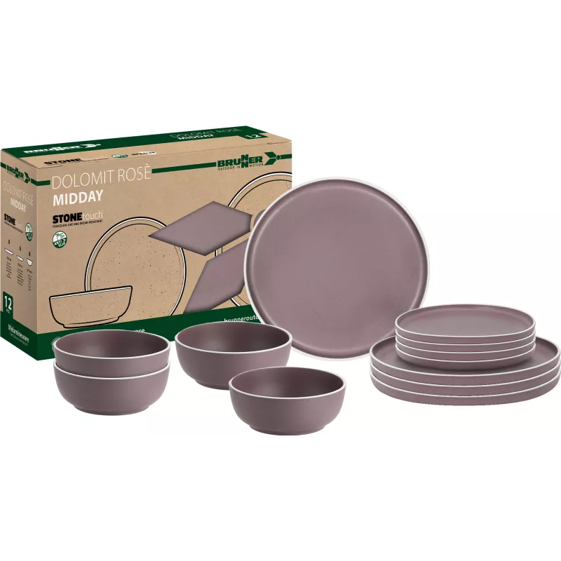 Il set Brunner Midday Dolomit Rosè è la soluzione ideale per chi desidera unire eleganza e funzionalità durante le proprie avventure all'aperto. Realizzato in melamina di alta qualità con finitura "Stone Touch", questo set da 12 pezzi offre un design raffinato e una resistenza superiore, perfetto per campeggi, picnic e viaggi in camper.