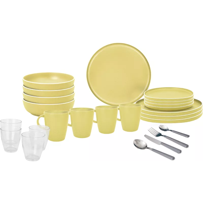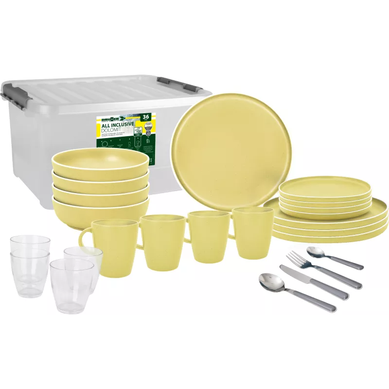 Il set Brunner All Inclusive Dolomit Yellow è la soluzione completa per chi desidera unire eleganza e funzionalità durante le proprie avventure all'aperto. Realizzato in melamina di alta qualità con finitura "Stone Touch", questo set da 36 pezzi offre un design raffinato e una resistenza superiore, perfetto per campeggi, picnic e viaggi in camper.