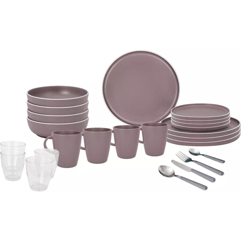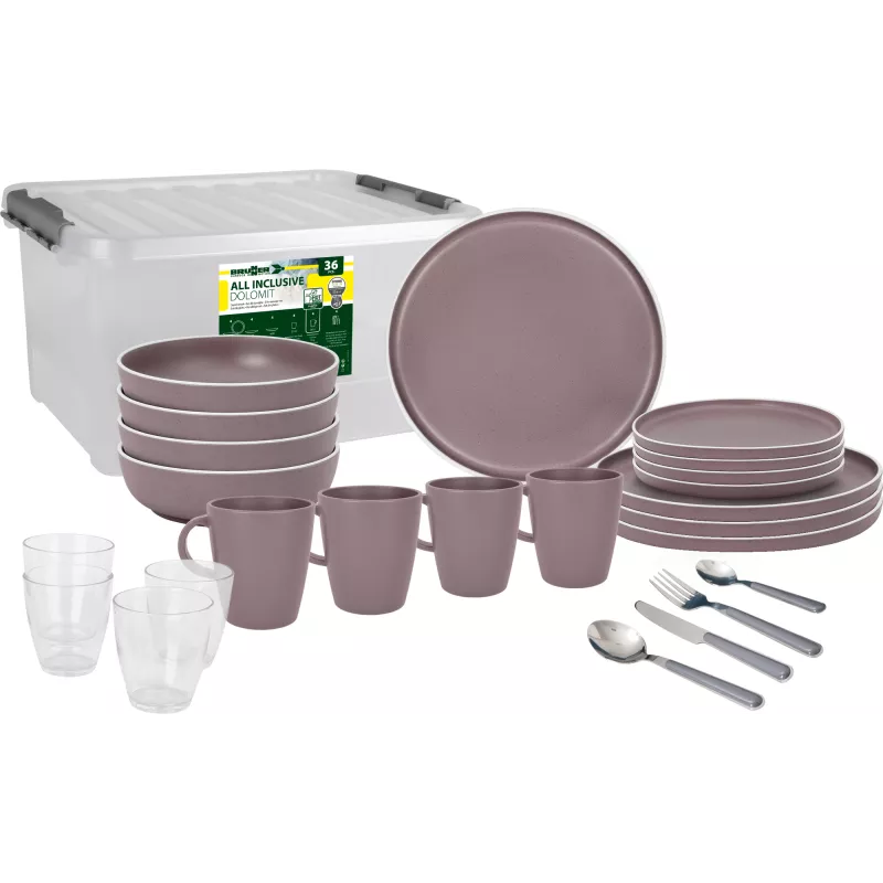 Il set Brunner All Inclusive Dolomit Rosè è la soluzione completa per chi desidera unire eleganza e funzionalità durante le proprie avventure all'aperto. Realizzato in melamina di alta qualità con finitura "Stone Touch", questo set da 36 pezzi offre un design raffinato e una resistenza superiore, perfetto per campeggi, picnic e viaggi in camper.