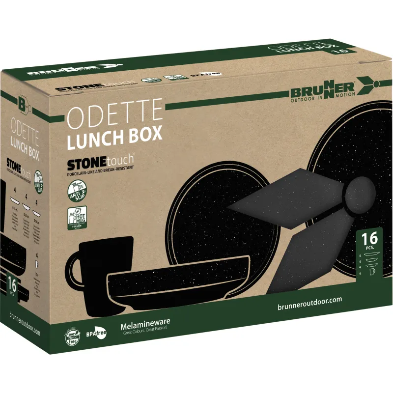 Il set Brunner Lunch Box Odette Double Black è la soluzione ideale per chi desidera unire eleganza e funzionalità durante le proprie avventure all'aperto. Realizzato in melamina di alta qualità con finitura "Stone Touch", questo set da 16 pezzi offre un design raffinato e una resistenza superiore, perfetto per campeggi, picnic e viaggi in camper.