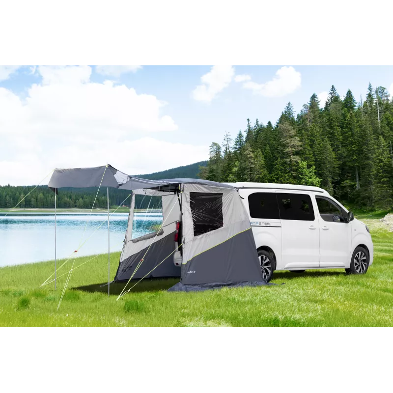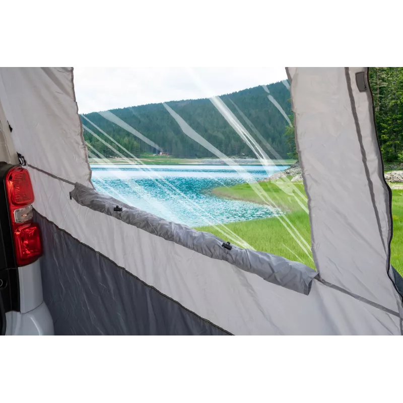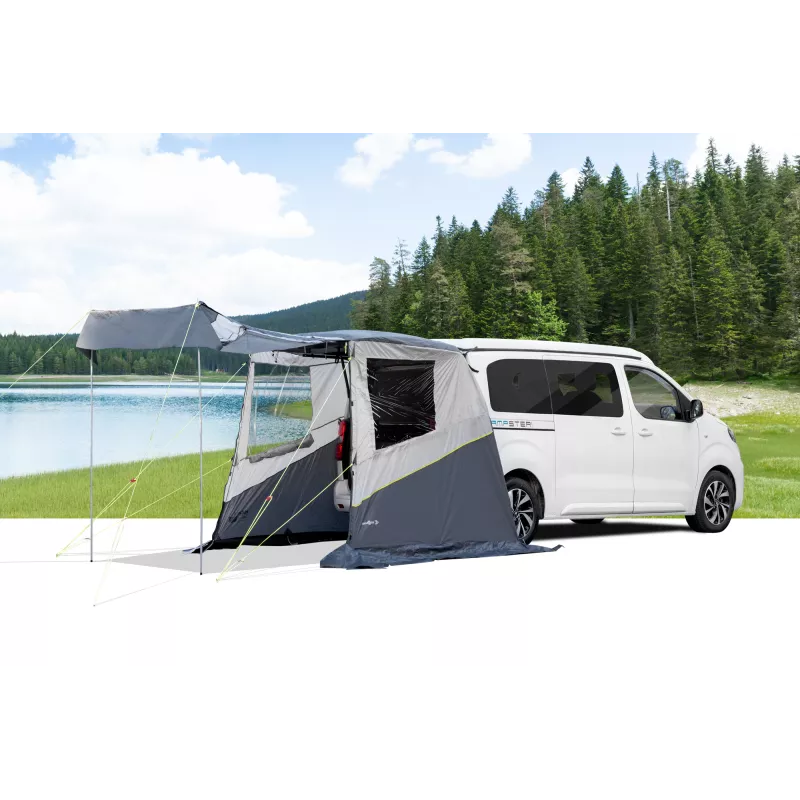 La Brunner Escape è una tenda posteriore di nuova concezione, progettata per il fissaggio diretto al portellone posteriore di veicoli con struttura identica come Peugeot Traveller, Citroën Spacetourer e Toyota Proace. Ideale per chi cerca una soluzione pratica e veloce, permette di ampliare lo spazio abitativo del veicolo in pochi minuti.