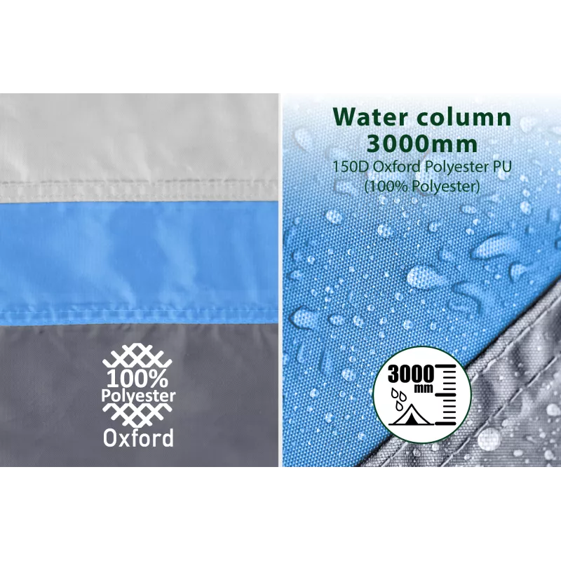 Il tunnel di collegamento è adatto a veicoli con altezza di fissaggio di 190 cm, rendendo la tenda compatibile con la maggior parte dei furgoni e van. Il catino/stuoia coprisuolo, la balza perimetrale con occhielli, i picchetti in plastica da 30 cm e i numerosi punti di ancoraggio contribuiscono a garantire protezione e stabilità anche in condizioni climatiche variabili.