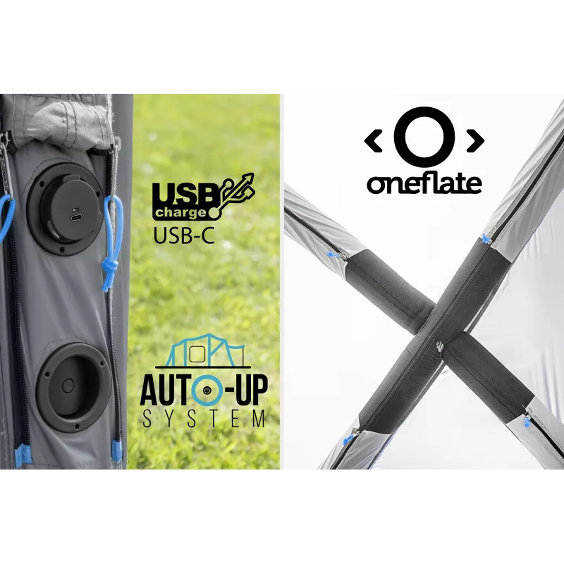 Una volta montata, la tenda si collega al veicolo tramite un tunnel di collegamento, che si adatta perfettamente al portellone aperto, consentendo di utilizzare la tenda come spazio aggiuntivo protetto. Il sistema di gonfiaggio Oneflate a valvola singola permette di gonfiare l’intera struttura in modo rapido e uniforme, garantendo stabilità e affidabilità.