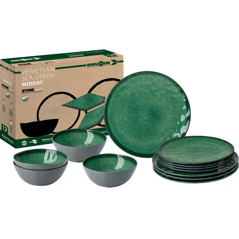 Il set Brunner Midday Venetian Sea Green è la scelta ideale per chi desidera unire eleganza e funzionalità durante le proprie avventure all'aperto. Realizzato in melamina di alta qualità con finitura "Stone Touch", questo set da 12 pezzi offre un design raffinato e una resistenza superiore, perfetto per campeggi, picnic e viaggi in camper.