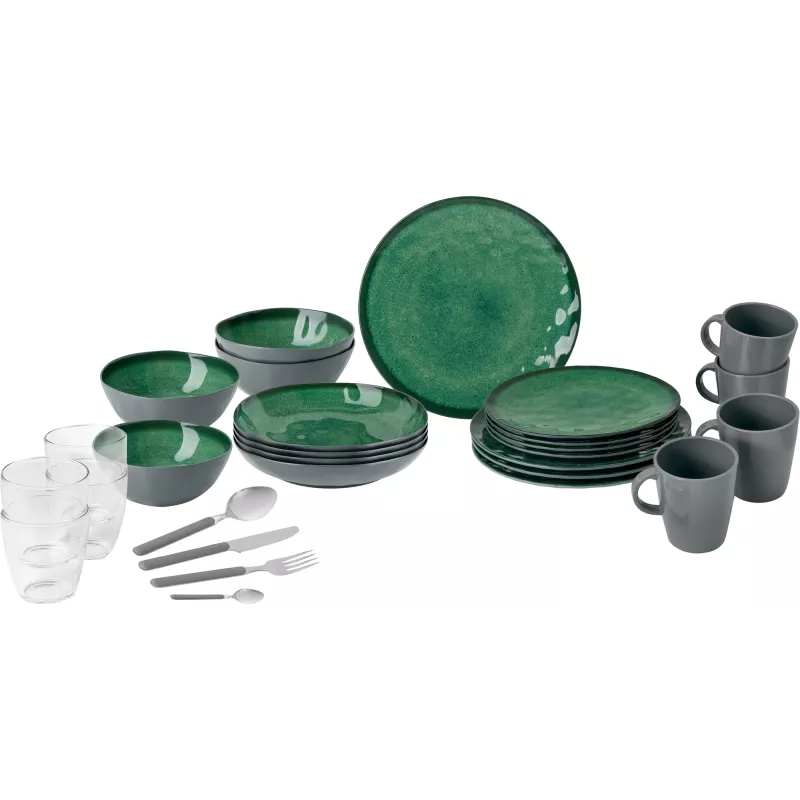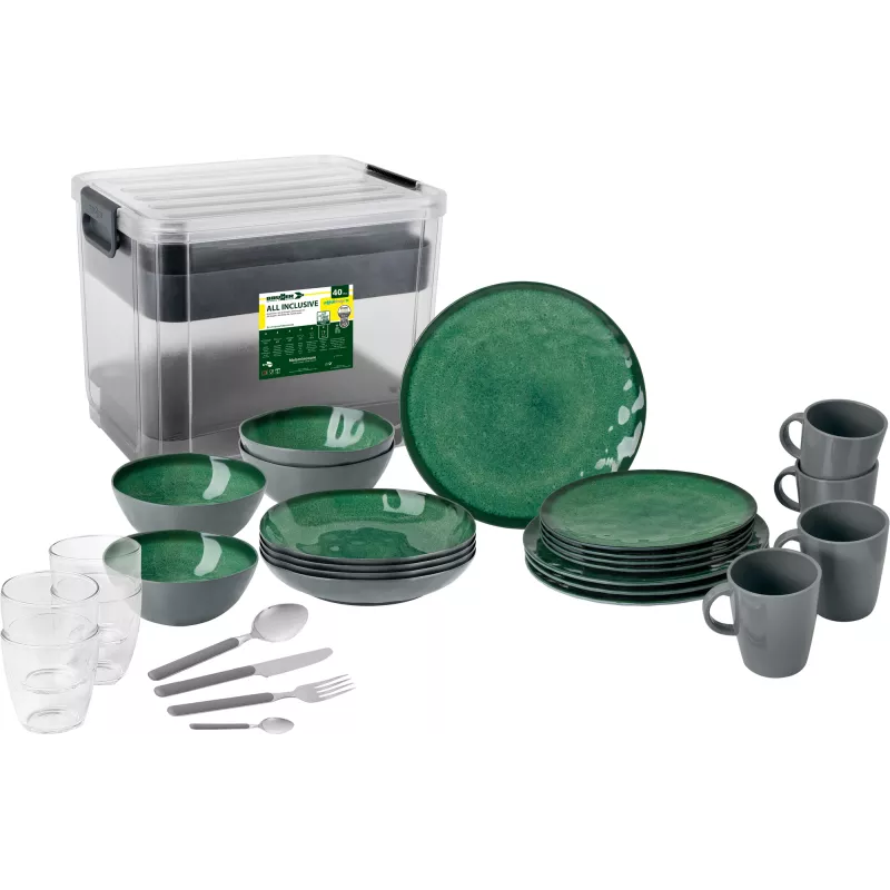 Il set Brunner All Inclusive VIP Venetian Sea Green è la soluzione completa per chi desidera unire eleganza e funzionalità durante le proprie avventure all'aperto. Realizzato in melamina di alta qualità con finitura "Stone Touch", questo set da 40 pezzi offre un design raffinato e una resistenza superiore, perfetto per campeggi, picnic e viaggi in camper.